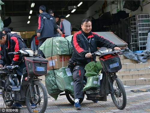 (作者:單新寧)雙十一期間,順豐快遞員在送貨,圖片來自視覺中國,未經授權,請勿使用