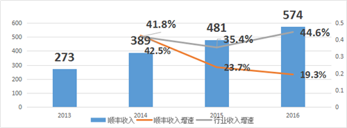 順豐在2016年的國內快遞業(yè)務(時效產品,不包括其重貨、冷運、倉配業(yè)務,這些也未計入郵政局快遞統(tǒng)計)收入增速只有15%左右。整體收入增速19.5%也遠遠落后于行業(yè)同期的44.6%。回看近年數(shù)據(jù),其增速早與行業(yè)脫節(jié),且差距拉大。在2016年低于行業(yè)25個點,低于申通圓通一半,不足中通1/3。
