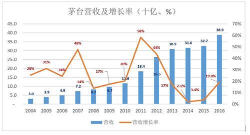 2004-2016年,茅臺營收平均年復(fù)合增長率為26.1%。這12年大致可分為兩段: