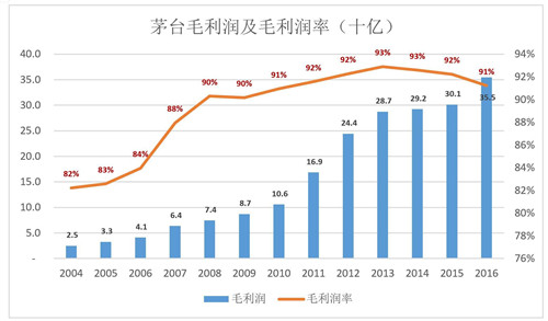 2004-2016年,茅臺毛利潤平均年復(fù)合增長率為24.8%,略低于營收增速。
