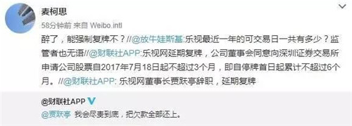 另外,關(guān)于樂視網(wǎng)股票復(fù)牌的事情,公告也一并做了回復(fù):公司董事會(huì)同意向深圳證券交易所申請(qǐng)公司股票自2017年7月18日起不超過3個(gè)月,即自停牌首日起累計(jì)不超過6個(gè)月。