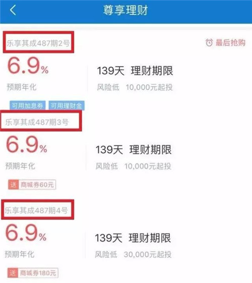 樂視金融APP上在售的樂享其成系列產(chǎn)品顯示,其中487期2號(hào)、3號(hào)和4號(hào)產(chǎn)品的投資期限完全相同,收益率也同為6.9%,并且都是7月7日起計(jì)算利息,只是2號(hào)和3號(hào)產(chǎn)品的理財(cái)起點(diǎn)起1萬(wàn)元,4號(hào)產(chǎn)品的理財(cái)起點(diǎn)為3萬(wàn)元。