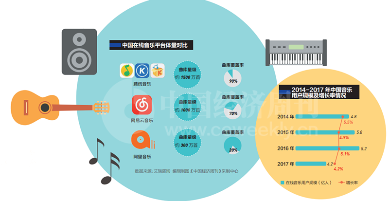 2016年7月,QQ音樂與酷我音樂、酷狗音樂并入騰訊音樂旗下后,騰訊開始對數(shù)字音樂版權(quán)著重布局。2017年3月和5月,騰訊音樂先后拿下中國大陸地區(qū)對環(huán)球音樂所擁有的音樂詞曲獨代權(quán)和數(shù)字版權(quán)分銷權(quán),并為此付出了3.5億美元現(xiàn)金及購買環(huán)球音樂1億美元期權(quán)的代價?!敖刂聊壳埃蚍秶鷥?nèi)有200多家唱片公司持有數(shù)字音樂的版權(quán),目前90%以上都已經(jīng)被騰訊拿下?!币晃痪W(wǎng)易云音樂內(nèi)部人士告訴《中國經(jīng)濟(jì)周刊》記者,騰訊音樂目前擁有的版權(quán)數(shù)量、廣度和對版權(quán)的投入都是業(yè)內(nèi)第一,其中不少是“獨家代理權(quán)”,相當(dāng)于緊緊地扎起了一個籬笆。