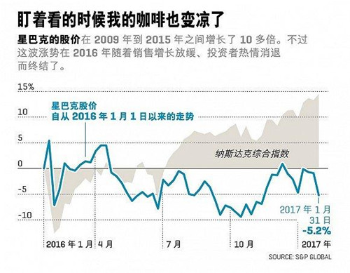 就連舒爾茨本人也說,星巴克的股票走勢(shì)有些不穩(wěn)。從2009年起到2015年,公司的股價(jià)增長(zhǎng)了1,170%,而在2016年則跌去了8%,這是自從2008年以來的首次下跌—盡管大盤上漲了10%。令人沮喪的是,下跌竟然找不到很明確的原因。有些懷疑指向了銷售增長(zhǎng)放緩、舒爾茨(第二次)宣布從首席執(zhí)行官的位置上退休后領(lǐng)導(dǎo)層的不確定性、甚或是這家總部位于西雅圖的公司制定了依靠海外市場(chǎng)的發(fā)展計(jì)劃,而特朗普?qǐng)?zhí)政后給跨國(guó)經(jīng)營(yíng)帶來了不確定因素。