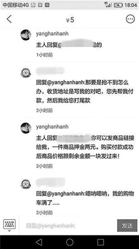 “你到時(shí)候把商品的鏈接給我,然后就是你的收貨地址,每件商品你要給我2塊錢的押金,到了11號(hào)那天,我來幫你搶東西,然后付款,沒搶到的話我會(huì)退押金,搶到的東西會(huì)直接由賣家郵給你,我把交易成功的截圖發(fā)給你之后,你給我付尾款就行了?!边@位出租“購物車車位”的商家說,之所以每件商品需要支付2元的押金,是為了防止違約。