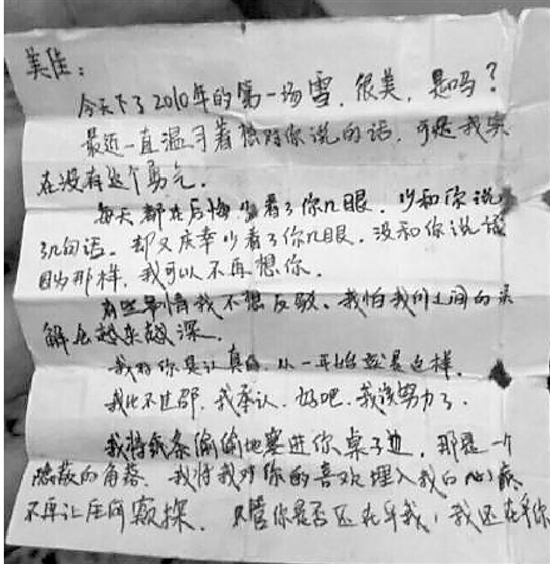 情書的紙張已經(jīng)泛黃、破損,是2010年第一場雪的那天,寫給一個叫“美佳”的人。