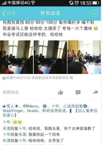 4月12日,報(bào)道了安順職業(yè)技術(shù)學(xué)院一名教師與學(xué)生在辦公室飲酒,并聲稱以喝酒多少來(lái)定考試成績(jī)之后,引起了該學(xué)院高度重視。據(jù)了解,目前,涉事教師已停職接受調(diào)查。