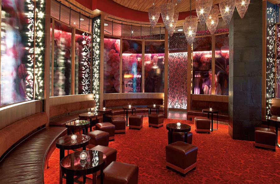 廳入口處的酒吧有一條60英尺長(zhǎng)的環(huán)形石墻,墻上布滿激光雕刻的盛開(kāi)的櫻桃花。酒吧墻面用的是3英寸厚的木板,地面則是用瑪瑙石做的裝飾。大廳的設(shè)計(jì)延續(xù)了酒吧的風(fēng)格,用了許多半透明的櫻桃花圖案來(lái)做裝飾,觀賞性極強(qiáng)。蕉麻葉子編織起來(lái)的三維空間將整個(gè)就餐區(qū)環(huán)繞起來(lái),讓來(lái)客們猶如身處海浪之中。顏色各異的蕉麻葉子像瀑布一樣從天花一瀉而下,包裹著一個(gè)充滿中東特色的空間。