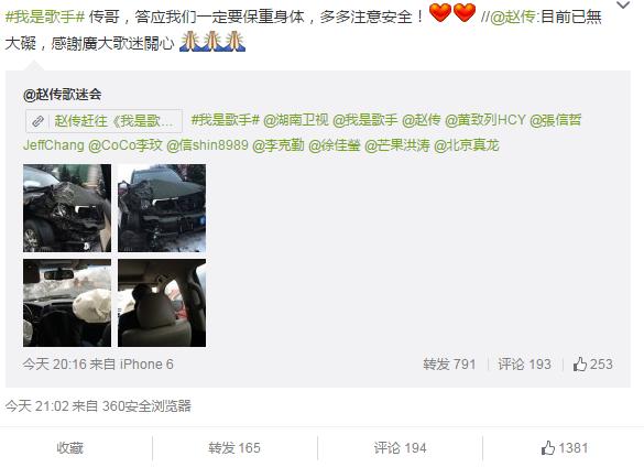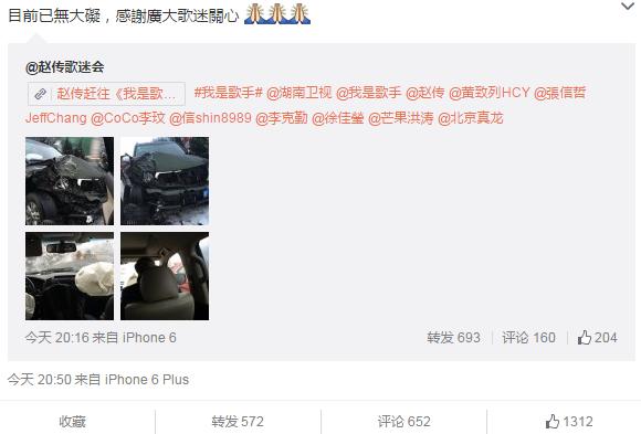 2月4日晚,ID為“趙傳歌迷會(huì)”的微博發(fā)布了一篇文章,描述了歌手趙傳在前往《我是歌手》錄制現(xiàn)場(chǎng)的途中發(fā)生車(chē)禍的情況。文章發(fā)布后不久就引發(fā)了網(wǎng)友熱議,趙傳本人也轉(zhuǎn)發(fā)了該微博并寫(xiě)到:“目前已無(wú)大礙,感謝廣大歌迷關(guān)心”。確認(rèn)了消息的真實(shí)性。