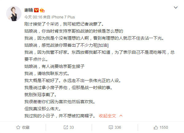 鳳凰網娛樂訊 《戰(zhàn)狼2》自上映以來好評不斷,票房接連刷新紀錄,截止8月1日晚票房已經達到15.51億。 由于《戰(zhàn)狼2》的成功,網絡上出現(xiàn)了很多張冠李戴的文章,把拍《戰(zhàn)狼》時謝楠說的話硬生生的搬到了《戰(zhàn)狼2》身上。 8月2日凌晨,謝楠在微博發(fā)文澄清養(yǎng)吳京的言論,那是戰(zhàn)一的事,不想被扣高帽子。