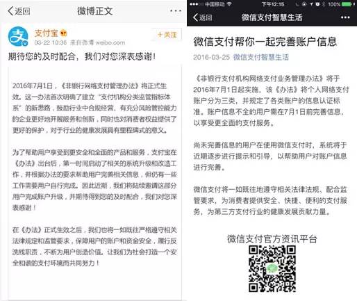 22日,支付寶官方微博發(fā)表聲明稱(chēng),“支付寶將在《辦法》出臺(tái)后正式啟動(dòng)相關(guān)系統(tǒng)升級(jí)與改造工作,并且?guī)椭脩暨M(jìn)行相關(guān)操作。”25日中午,微信支付在其官方賬號(hào)“微信支付智慧生活”發(fā)布了題為《微信支付幫你一起完善賬戶信息》的短文。