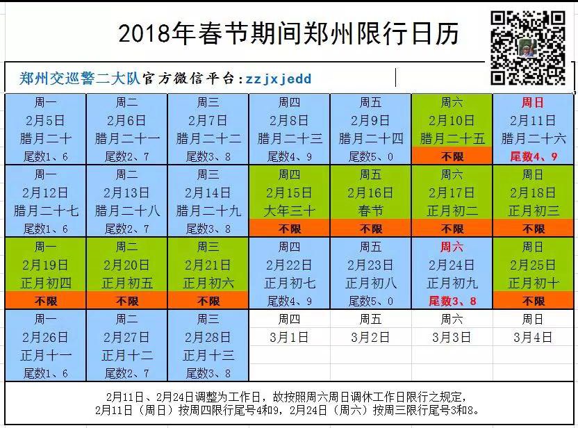 依據(jù)《國務(wù)院辦公廳關(guān)于2018年部分節(jié)假日安排的通知》(國辦發(fā)明電〔2017〕12號(hào))(以下簡稱為《通知》)和《鄭州市人民政府關(guān)于實(shí)施機(jī)動(dòng)車限行措施的通告》(鄭政通〔2017〕42號(hào))(以下簡稱為《通告》),現(xiàn)將2018年春節(jié)假期前后的機(jī)動(dòng)車限行規(guī)定通知如下:
