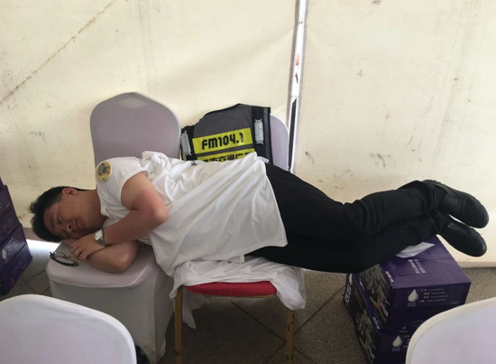 為了保證大家順利進(jìn)園,《南方談交通》的主持人劉翔第一天就被曬傷了,間隙時(shí)間,拼出來(lái)兩個(gè)凳子就瞬間睡著。