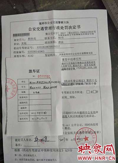 11月2日下午16時許,偃師市交警大隊給韓先生開具了公安交通管理行政處罰決定書【2017】410321-2900412916號,處罰900元。韓先生急匆匆去交了900元罰款后,拿了交警隊的交款單去了交通局,交通局于當(dāng)天晚上17時30分許,給韓開具放車單。韓去停車場看到自己的車時,已經(jīng)是當(dāng)天晚上20時以后了。