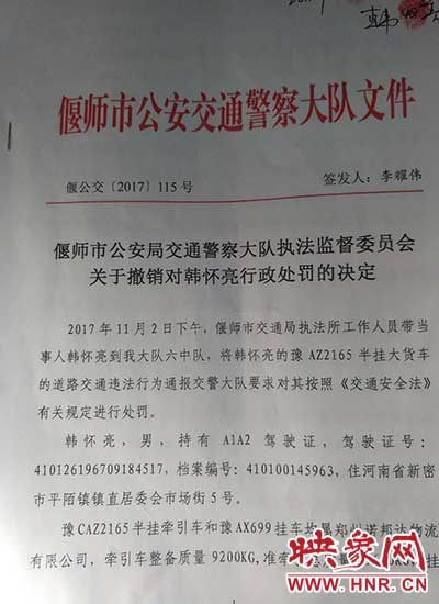 因處罰決定書存在明顯的問題,偃師市公安局交警大隊認(rèn)識到自己的錯誤。12月16日,偃師市公安局交警大隊,決定撤銷【2017】410321-2900412916號處罰決定書。12月17日上午,偃師交警大隊派法制科黎科長和督察李警官趕到鄭州,找韓先生退錢。