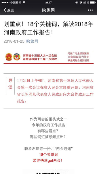 映象網(wǎng)官方微信策劃推出原創(chuàng)策劃《河南人,2018給你穩(wěn)穩(wěn)的幸福!》、《你好,我是河南!這是我的五年成績單,請接收!》、《2018年,河南都有哪些“小目標”?》、《劃重點!18個關(guān)鍵詞,解讀2018年河南政府工作報告!》。每篇都刷屏朋友圈,網(wǎng)友積極轉(zhuǎn)發(fā)點贊,稱“看完真的覺著穩(wěn)穩(wěn)的幸福”。