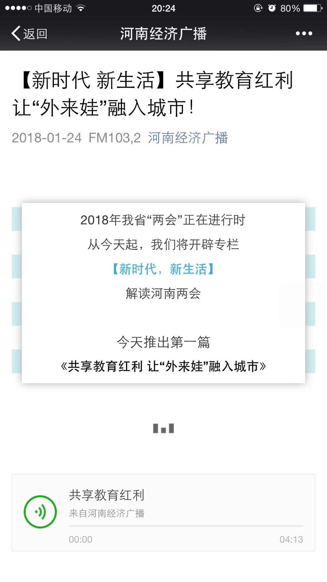 河南經(jīng)濟廣播推出兩會專欄“新時代 新生活”,推出五篇深度報道:《共享教育紅利 讓“外來娃”融入城市!》、《藍天白云下的大數(shù)據(jù)“護衛(wèi)隊”!》、《讓家庭醫(yī)生打通分級診療“最后一公里”》、《加大住房保障力度,圓百姓安居夢!》、《扎根中原大地,“創(chuàng)”出美好未來!》,總時長25分鐘。這一組報道用“講故事說新聞”的方式,關(guān)注隨遷子女享有與城市學生一樣的高品質(zhì)教育、環(huán)保技術(shù)革新、返鄉(xiāng)下鄉(xiāng)創(chuàng)業(yè)扶貧、保障房建設、生態(tài)文明等熱點民生話題,每期采訪都做到聲音全面、數(shù)據(jù)詳實、人物典型、立意深遠,通過對代表、委員建議、對話部門、基層聲音等四個方面,對熱點話題報道做到有“廣度 高度 深度 溫度”。