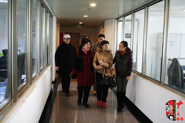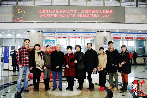 河南電臺(tái)戲曲廣播副總監(jiān)張彤(右一)及主持人迎接京劇荀派傳人孫毓敏(左二)、