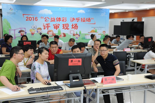 評審工作分四組進行,每組評審人員首先對報名學(xué)校提供的基本情況進行逐項了解,同時,通過學(xué)校提供的校園、現(xiàn)有操場、器材室等實景照片,對是否提供捐贈進行綜合打分。最后由工作人員對每組評委的打分進行匯總,按照每所學(xué)校得分高低進行排序,前25名的學(xué)校入圍2016“公益體彩 快樂操場”(河南)實地考察名單。