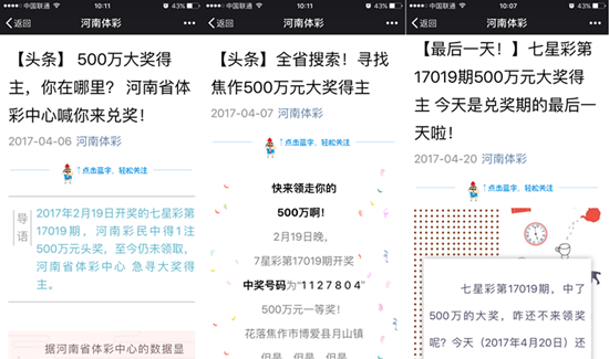 大獎中出之后,中獎人一直沒有到河南省體彩中心兌獎,而60天的兌獎有效期卻在一天一天流逝,眼看2017年4月20日的最后兌獎期限將至,為了更好的保護彩民利益,省體彩中心自2017年4月6日開始,通過省市網絡、報紙、廣播、官微、體彩銷售網點廣播消息和尋人啟事等多種形式發(fā)布消息,努力尋找和提醒中獎得主。
