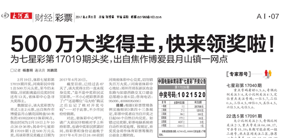 2017年2月19日,七星彩第2017019期開獎,一彩民在焦作市博愛縣月山鎮(zhèn)花園轉盤50米東4108220013體彩銷售網點,花2元錢買了1注“七星彩”,幸運中得一等獎,獎金高達500萬元。