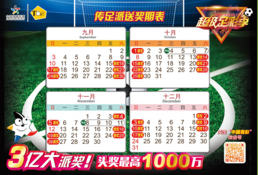 根據(jù)9月-12月的足彩競猜場次安排,各周末獎期受注賽事均以歐洲五大聯(lián)賽為主,其中9月份14場勝平負(fù)游戲和任選9場游戲的指定派獎期為第17134期、17135期、17139期、17140期、17144期、17145期(10月1日停售)。也就是說,未來連續(xù)3個周末獎期均有派獎。今年10月2日-8日、11月6日-12日兩周是國際比賽日,周末五大聯(lián)賽將暫停,預(yù)計將指定當(dāng)周中獎期派獎,受注賽事為各大洲世界杯預(yù)選賽及部分國家隊友誼賽。