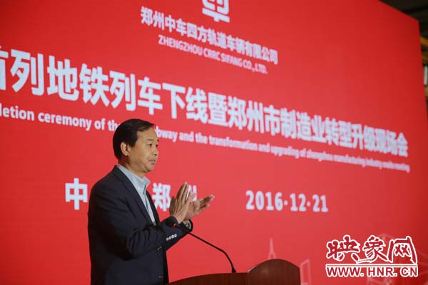 期間,河南省政府副秘書長王夢飛宣讀省委省政府賀信,中車青島四方機車車輛股份有限公司總經(jīng)理馬云雙代表投資方介紹企業(yè)產(chǎn)品產(chǎn)業(yè)情況,“鄭州造”首列地鐵列車用戶方鄭州市軌道交通有限公司黨委書記、董事長、總經(jīng)理張洲致辭;鄭州市政府市長程志明分別做重要講話。