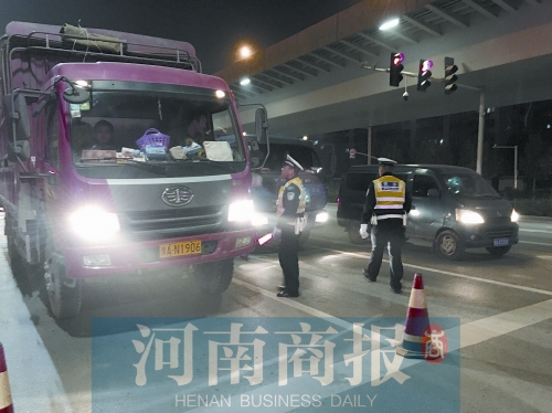 14日夜間開(kāi)始,交警部門(mén)在鄭州市的三環(huán)和四環(huán)重要路口等處部署警力,展開(kāi)嚴(yán)查。截至15日凌晨近2時(shí),在鄭州市的統(tǒng)一行動(dòng)中共查處貨車(chē)、渣土車(chē)等161輛,處罰駕駛?cè)?3名。