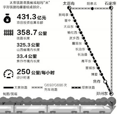 太焦鐵路是我省規(guī)劃的“米”字形鐵路的重要組成部分,項目投資估算總額為431.3億元,線路長度358.7公里,其中山西省境內325.3公里,我省焦作市境內33.4公里。工程計劃建設周期為5年,設計時速為每小時250公里。全線設太原南、新鳴李、晉中、太谷東、榆社西、武鄉(xiāng)西、襄垣東、長治東、長治縣、高平東、晉城東、博愛及焦作13個車站。