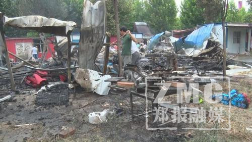 現(xiàn)場村民介紹,火災發(fā)生時附近有人正在做滿月酒,屋頂電線突然“噼啪”作響,火星濺下引燃了安置區(qū)的簡易房,失火房屋內(nèi)放置有生產(chǎn)包的設備和成捆的布匹。