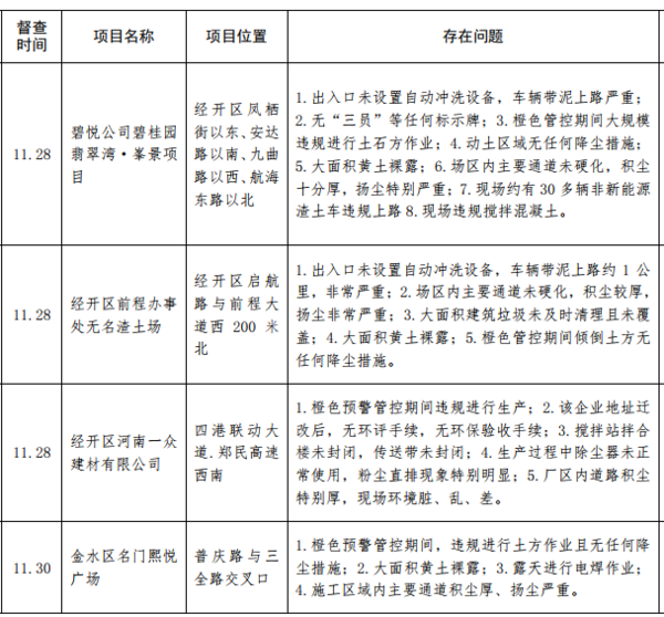 12月7日,記者從鄭州市環(huán)境污染防治攻堅辦了解到,11月27日至12月3日,鄭州市環(huán)境污染防治督導(dǎo)組重點對全市"封土行動"方案、橙色預(yù)警管控措施落實和30天沖刺行動方案落實情況進行督導(dǎo)檢查。從督查情況來看,大部分單位都夠按照要求,落實"封土令"和預(yù)警管控措施,但也有個別施工工地和企業(yè)未按要求停工、停產(chǎn)或限產(chǎn)減排。