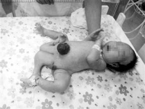 四腿寶寶的肚臍膨出,如一個(gè)深色的肉球,長(zhǎng)有四條腿和兩個(gè)生殖器,其中外面的兩條腿發(fā)育比較好。