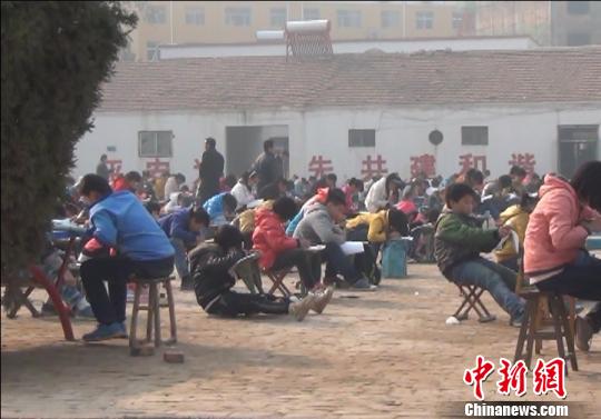 緊鄰臺前縣政府1公里之遙的城鎮(zhèn)中學(xué),由于教室不充裕,學(xué)生在室外空地上考試?!《w 攝
