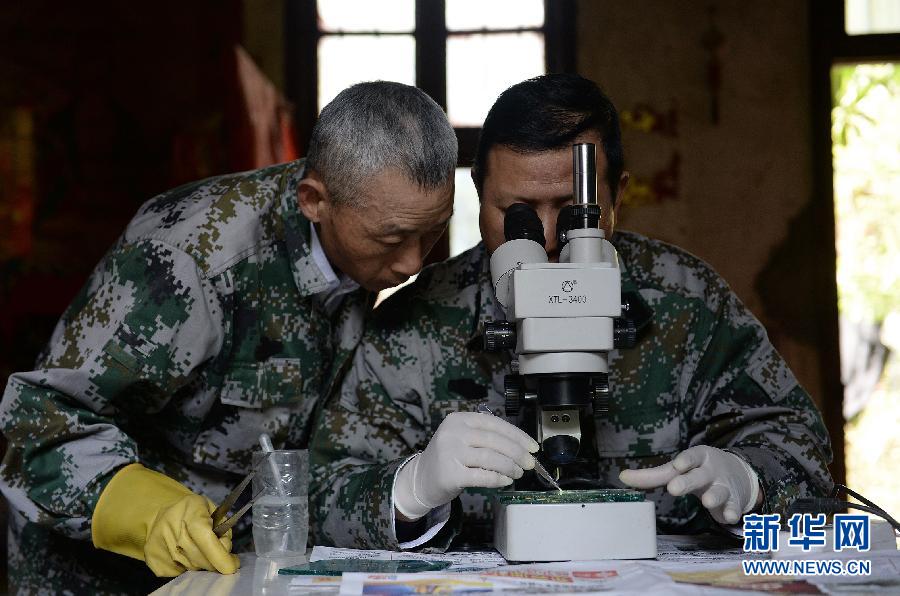 在租住當(dāng)?shù)剞r(nóng)民的房子里,滅螺隊(duì)員熊林根(右)用顯微鏡觀察當(dāng)天收集的釘螺樣本(4月14日攝)。 新華社記者 萬(wàn)象 攝