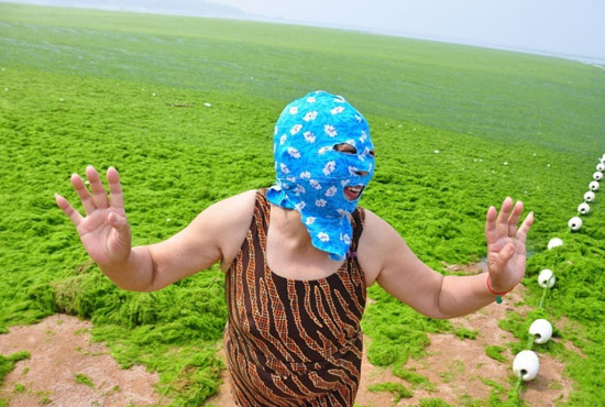 2013年7月3日,山東青島青島高溫來襲,“青島大媽”不懼滸苔,戴著“強盜面具”出現在海水浴場消暑降