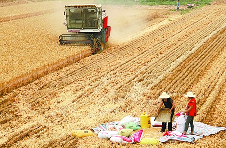 6月9日,收割機(jī)正在延津縣搶收小麥。豫北小麥每年收割較晚,單產(chǎn)最高,今年產(chǎn)量有望好于去年。記者 王天定 攝