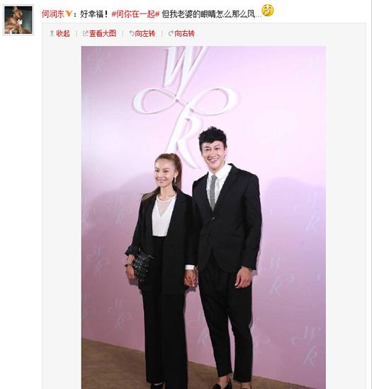 ‘何你在一起’但我老婆的眼睛怎么那么鳳……”照片中,何潤東老婆身材高挑纖瘦,扎著高高的馬尾,兩人身穿情侶黑色套裝,甜蜜的手牽手,幸福之意溢于言表,另外是夫妻倆合影林心如的照片,林心如一襲露肩白色長裙,何潤東和老婆分別站在林心如兩側(cè).