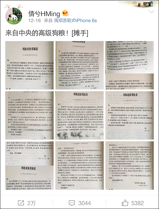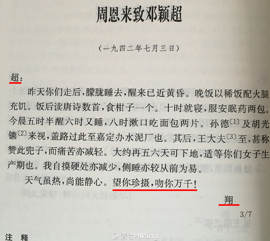 最近,新浪博主@倩兮HMing 送上了這把跨越數(shù)十年的,來自中央的高級狗糧:1942至1955年,9封周恩來與鄧穎超的往來書信。據(jù)觀察者網(wǎng)查詢,這些書信都出自《周恩來鄧穎超通信選集》,這本選集由中共中央文獻研究室編撰,1998年2月出版,全書約10萬字。