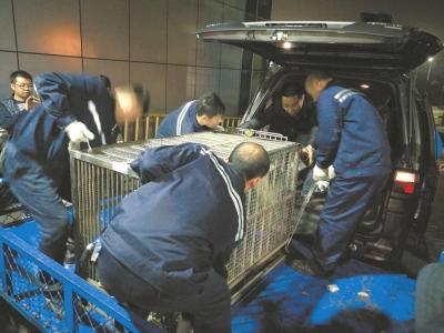 經(jīng)過(guò)近一個(gè)半小時(shí)的空中旅行,剛下飛機(jī)的“蜀蘭”還有一點(diǎn)驚慌。面對(duì)機(jī)場(chǎng)運(yùn)輸工作人員,她有些焦慮地在籠子里轉(zhuǎn)來(lái)轉(zhuǎn)去,變換姿勢(shì)。