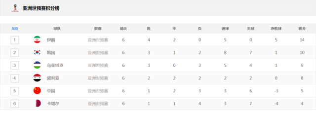 騰訊體育3月28日 落后第2名韓國5分,落后第3名烏茲別克斯坦4分,落后第4名敘利亞3分,對于前6輪只手握5分的國足來說,目前的晉級形勢依舊嚴(yán)峻。