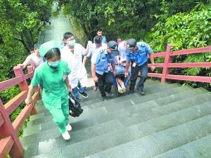 盧先生繼續(xù)攙扶著妻子往山下走。當他們走到離山腳還有900米時,遇到了兩名前來施救的輔警,兩人在兩名輔警的攙扶下,繼續(xù)慢慢向山下走去。走到離山腳約600米距離時,120急救人員、景區(qū)工作人員及兩名輔警也趕來了。醫(yī)護人員對他們進行了檢查和包扎后把王女士抬上擔架。王女士一邊輸液一邊被抬下山。40分鐘后,終于到達山下,王女士被送往醫(yī)院救治。