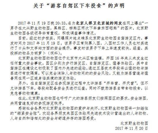 今天上午,記者從北京大興野生動(dòng)物園了解到,該事件發(fā)生在園內(nèi)自駕游覽區(qū)內(nèi),事發(fā)時(shí)間為11月19日,目前初步查明,男子投擲的物品為胡蘿卜(飼料)。