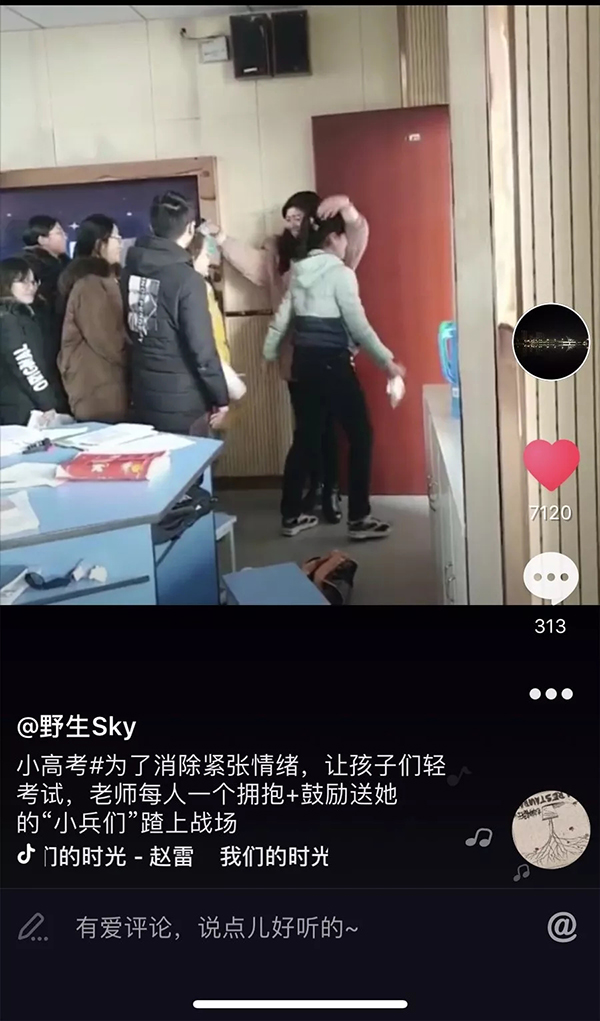 “這么做目的是給孩子們減壓,給他們打氣”,胡梅說,她這么做已有四年,每逢諸如“小高考”和高考這樣的重大考試之前,她都會(huì)給學(xué)生們挨個(gè)擁抱鼓勵(lì)。