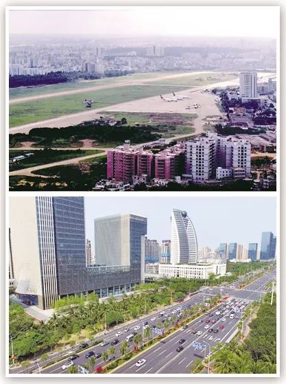 拼版照片為??谑袊d大道,曾經(jīng)是??诖笥⑸綑C場(上圖為1999年5月新華社記者姜恩宇攝,下圖為2018年4月14日新華社記者郭程攝)。 新華社發(fā)