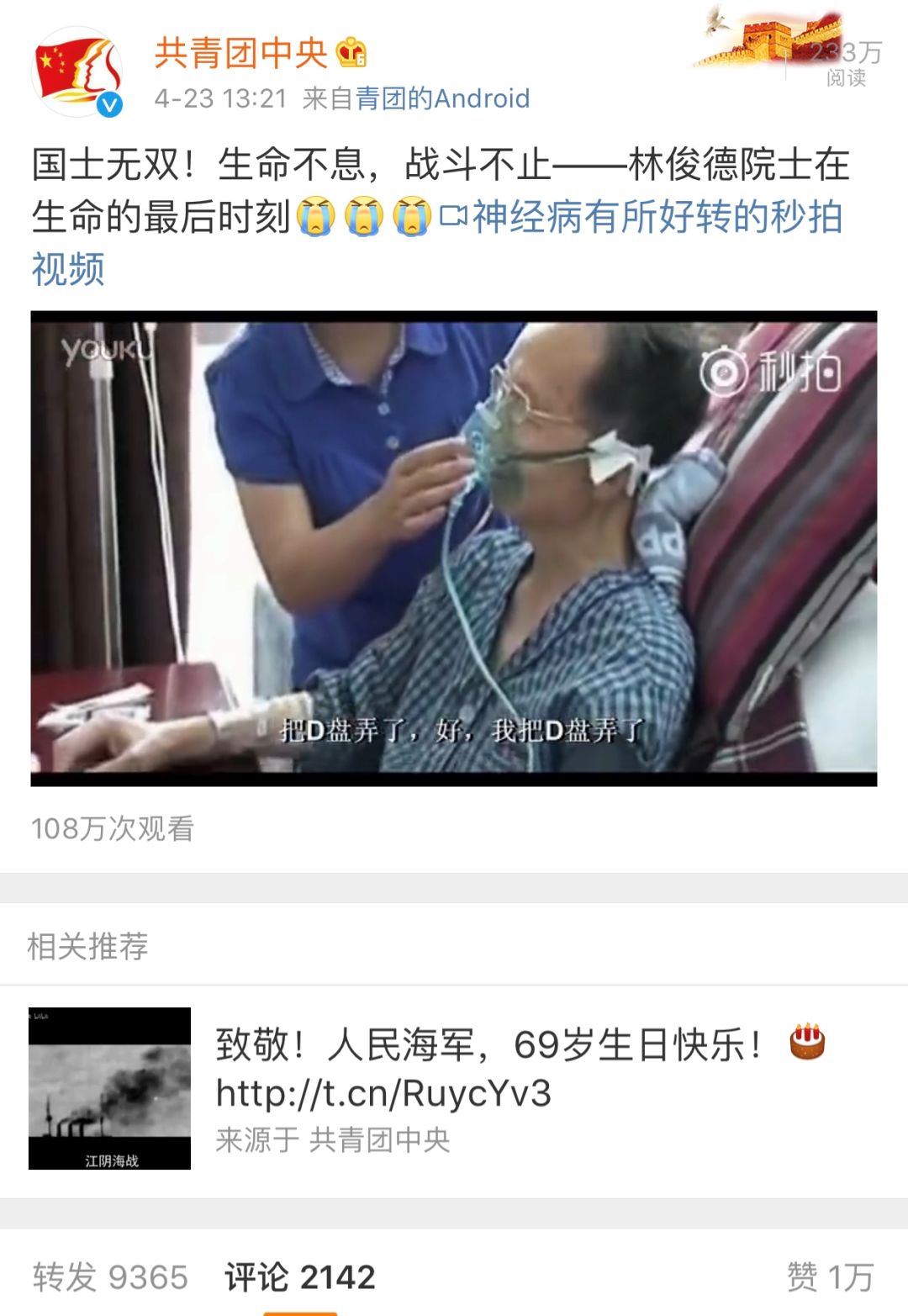 23日,@共青團(tuán)中央 微博發(fā)的這個(gè)視頻,近萬(wàn)網(wǎng)友轉(zhuǎn)發(fā),評(píng)論令人動(dòng)容…