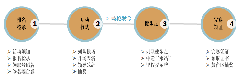 現(xiàn)場流程:報(bào)名檢錄——啟動儀式——健步走——完賽證書