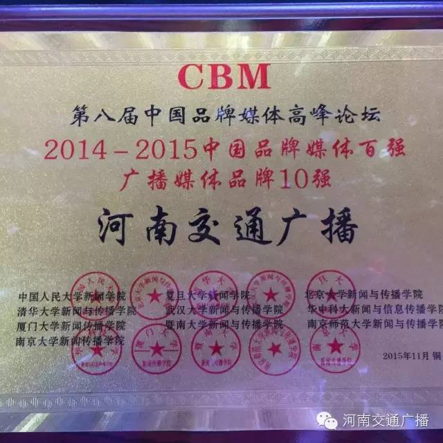 FM1041河南交通廣播榮獲2014-2015中國(guó)品牌媒體百?gòu)?qiáng)廣播媒體品牌10強(qiáng)。在河南廣播媒體中,僅此一個(gè)。這也是對(duì)河南交通廣播在節(jié)目、活動(dòng)、服務(wù)方面成績(jī)的肯定。