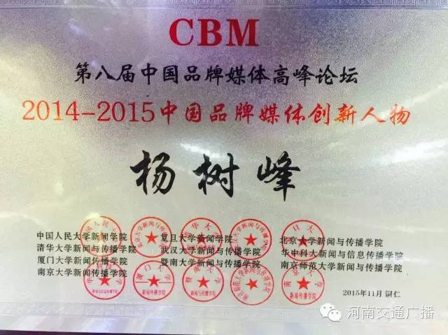 本屆論壇上,河南交通廣播總監(jiān)楊樹(shù)峰榮獲2014-2015中國(guó)品牌媒體創(chuàng)新人物稱號(hào),這是對(duì)他個(gè)人成就的肯定,更體現(xiàn)了河南交通廣播運(yùn)管機(jī)制的成功,人文關(guān)懷、扁平化管理,民主決策、智慧碰撞,從決策層發(fā)出的指令,成為掌控河南交通廣播精準(zhǔn)運(yùn)行,走向成功的靈魂,而我們一切的努力,都是為了實(shí)現(xiàn)一個(gè)目標(biāo):無(wú)論何時(shí)、何地,無(wú)論現(xiàn)在、未來(lái),伴你出行每一刻。