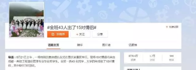 這條消息,最早出現(xiàn)在5月21日的微博和各大網(wǎng)站上,“全班一共43人,大學四年成就了15對情侶,畢業(yè)之際在重慶某景區(qū)舉辦集體婚禮?!本W(wǎng)友直呼:這簡直不可思議。