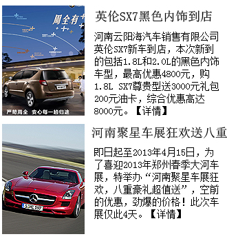 導(dǎo)語(yǔ)映象網(wǎng)汽車(chē)頻道,為了給廣大愛(ài)車(chē)人士提供更多的車(chē)市信息,創(chuàng)辦了車(chē)市行情欄目,欄目提供中原車(chē)市各大4S店的打折信息、活動(dòng)等信息,為您購(gòu)車(chē)、選車(chē)、試車(chē)做向?qū)А?/FONT>